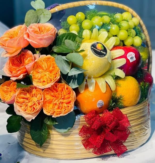 Sự kết hợp giữa trái cây và hoa hồng tạo nên món quà vừa đẹp mắt vừa giàu cảm xúc.