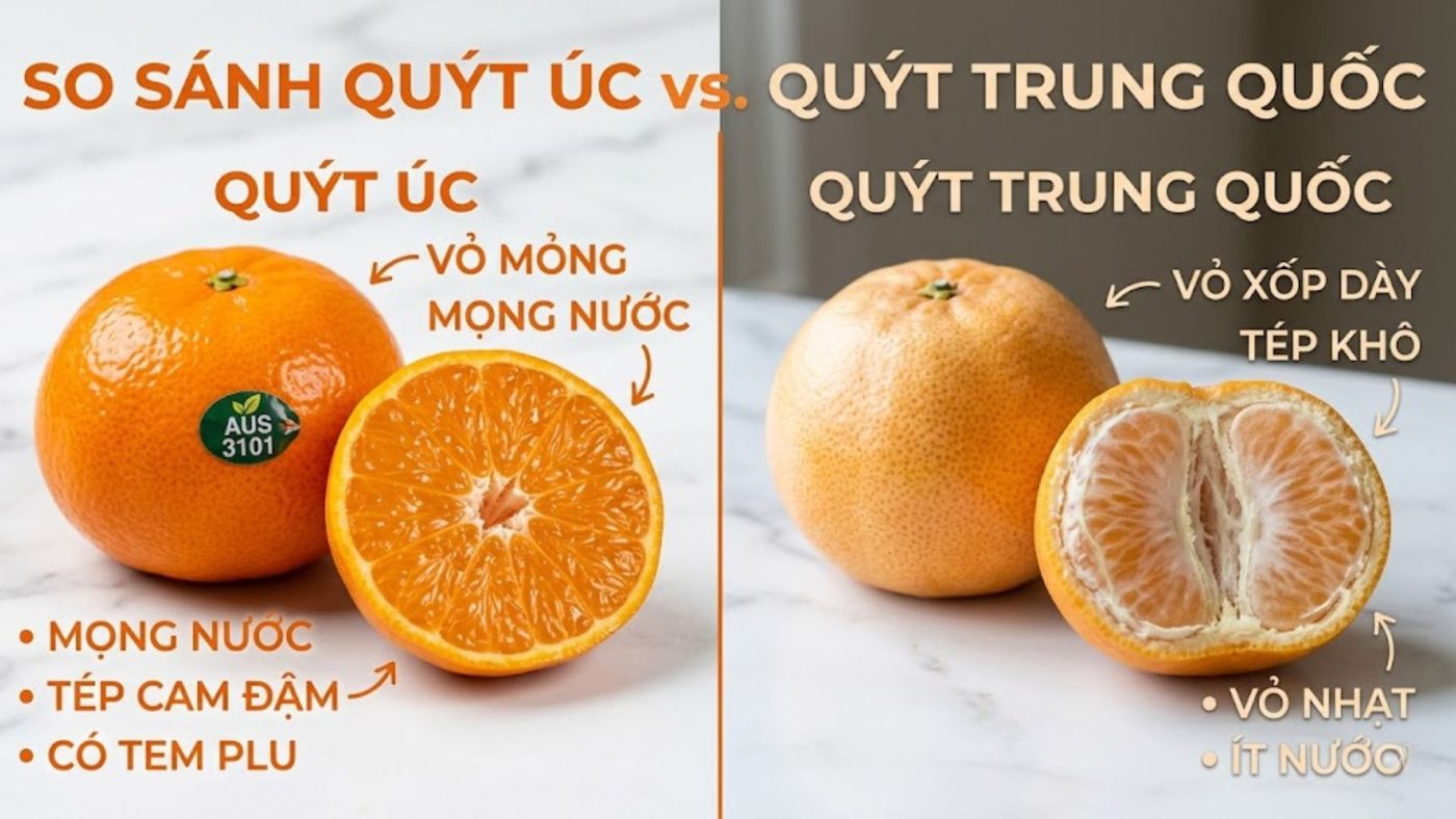 Thứ nhất, so sánh với quýt Ôn Châu (Trung Quốc). Quýt Trung Quốc thường có vỏ màu vàng nhạt hơn, vỏ dày và xốp, dễ bị phồng rộp. Khi ăn, thịt quả thường bị khô, nhạt nhẽo và không có mùi thơm tinh dầu đặc trưng như hàng của Úc.